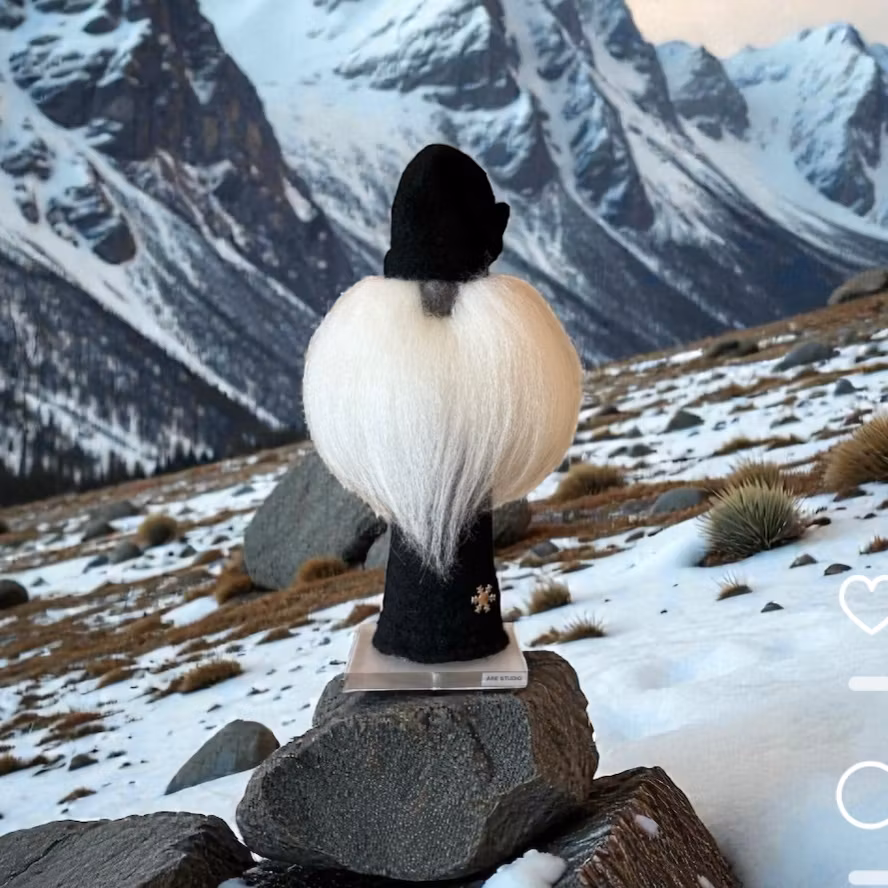 Denna hustomte är vår "klassiska" Åretomte med dress i ulltextil. Egendesignad plexiglasfot som ger ett stilrent intryck där man får känslan av att tomten står på is/snö. Bär äkta skägg i fårskinn och handfiltad nos med ull från Årefjällens egna får. Höjd ca 30-32 cm hög.