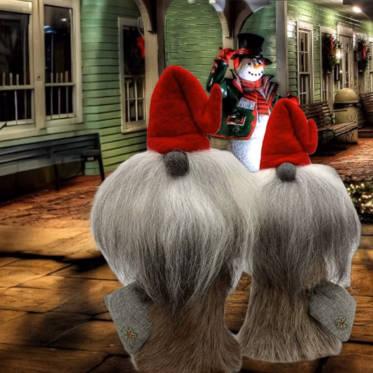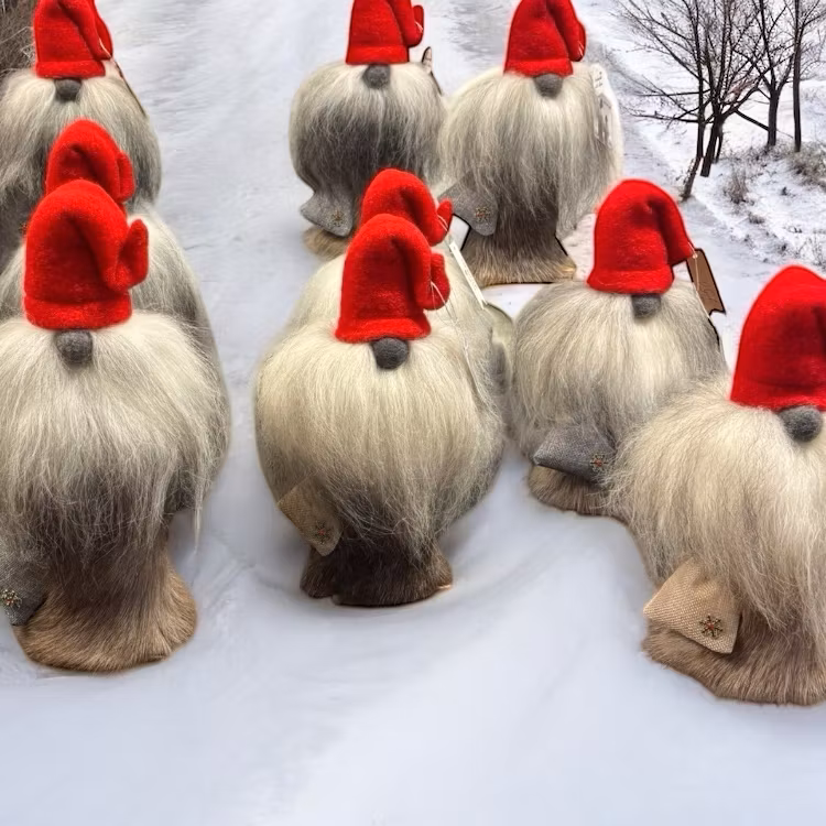 Tomte med julsäck. Denna finns med klarröd luva med grå julsäck. Fot i äkta ek. Tomten med röd luva bär lite mörkare dress i äkta renskinn och ett pins/märke i vacker snöflinga på sin julsäck. Tomten med vit mössa bär dress i ljusare renskinn och snöflinga pins i metall. Skägg i ljust äkta fårull. Höjd ca 29-31 cm hög.